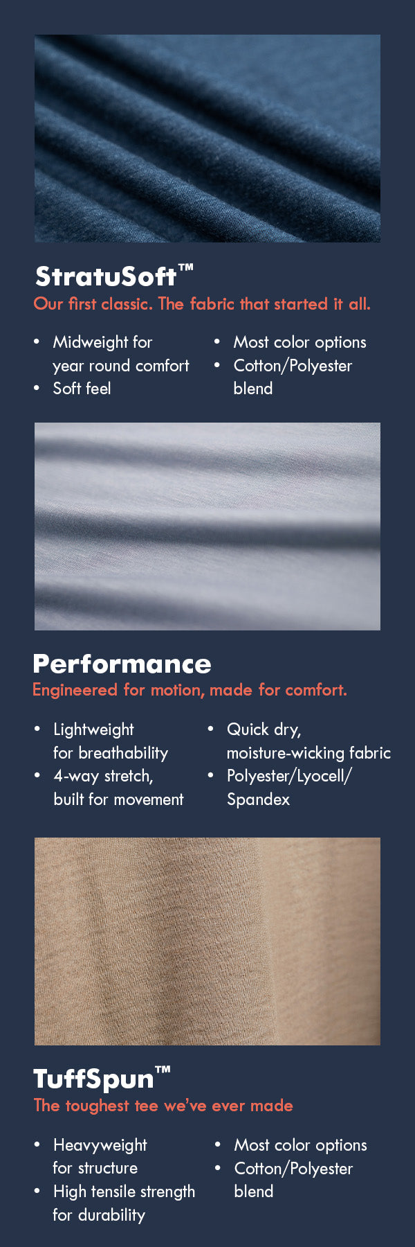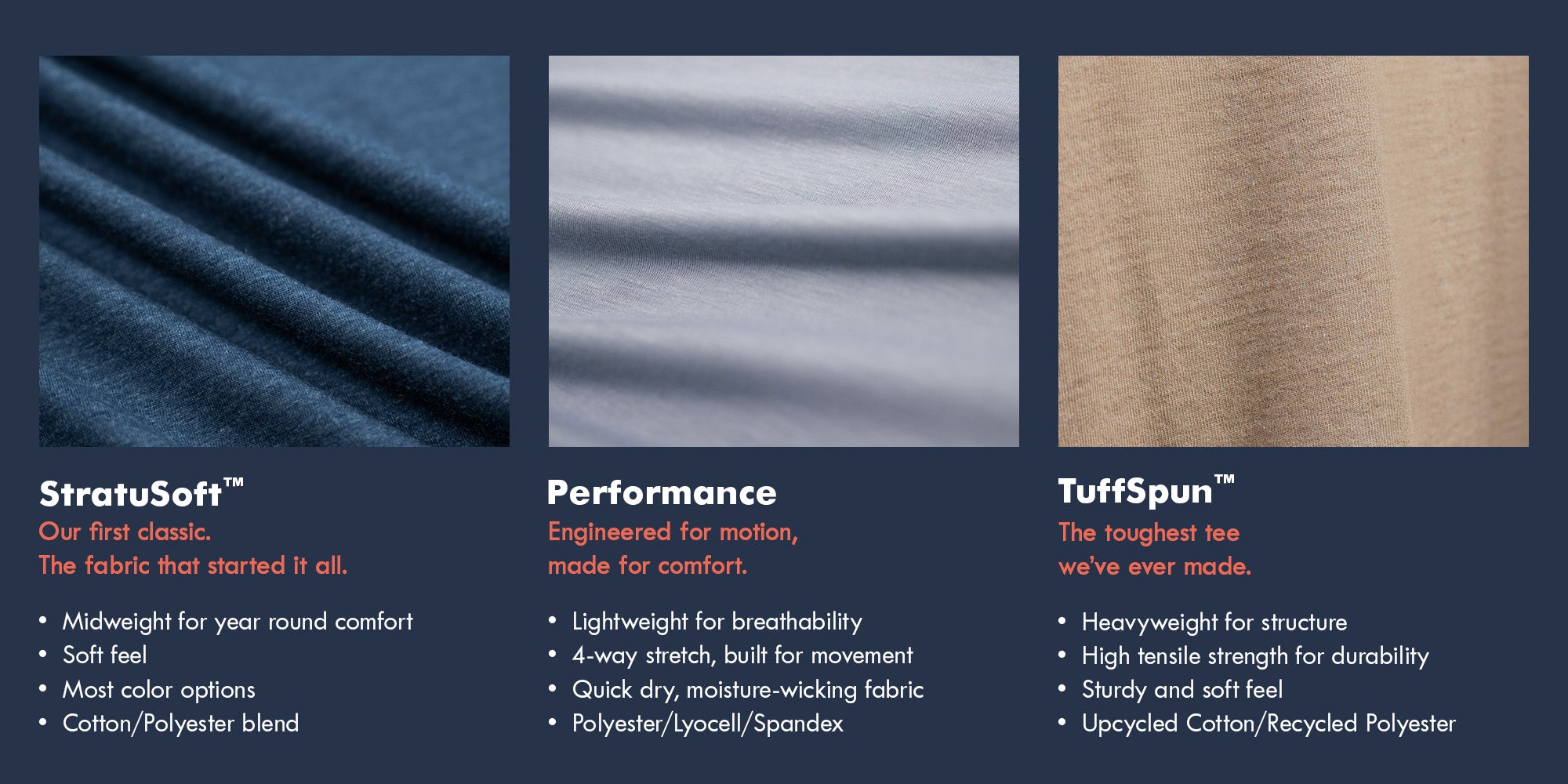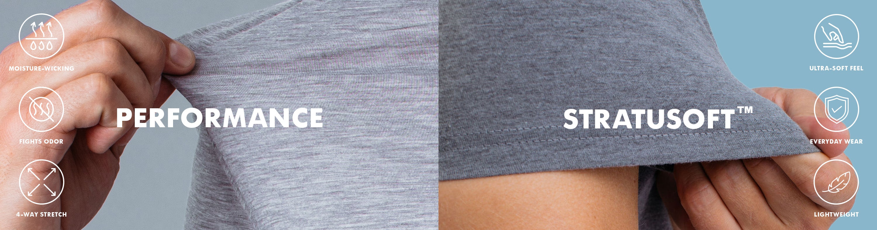 Enjoy premium comfort, whatever your lifestyle, with StratuSoft and Performance apparel. StratuSoft™ is ultra-soft, durable, and perfect for all-day wear while Performance apparel is moisture-wicking, breathable, and made for movement. Choose StratuSoft™ for everyday comfort or Performance for sweat control and flexibility or grab both and cover all your bases.