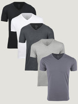 Upgrade your daily style with our essential 5-pack of basic tees. This set features black, white, and grey crew neck or v-neck styles, ensuring you're covered for any occasion. Crafted for versatility and durability, these tees effortlessly complement any outfit, from casual jeans to sleek chinos or comfy joggers.