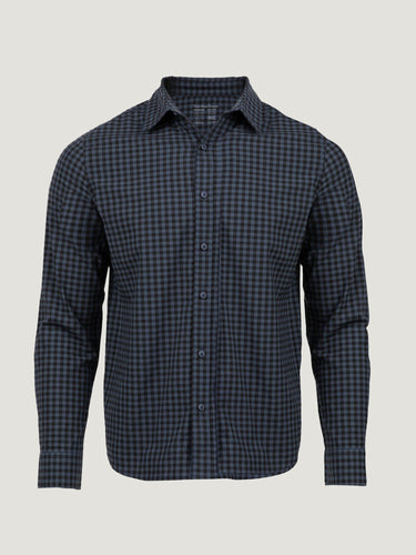 Add a little fun to your wardrobe with the Black + Navy Gingham Long Sleeve Button Up. This playful take on a classic pattern combines form and function, with a spread collar and curved hem that flatter any look. It’s the perfect shirt to throw on for a casual weekend adventure or an impromptu night out. The stretch fabric keeps you moving in comfort, while the wrinkle-resistant feature ensures you're always ready to go at a moment’s notice.