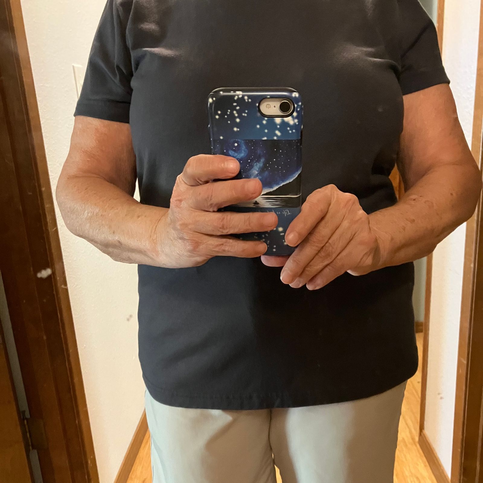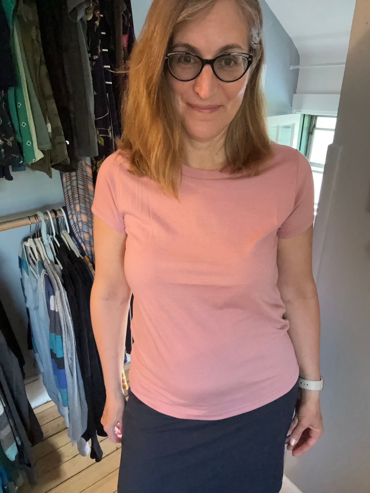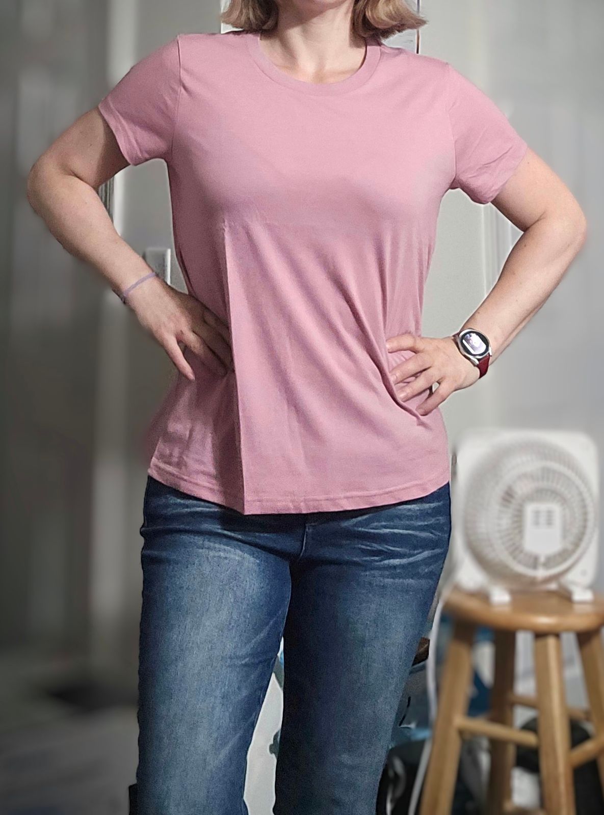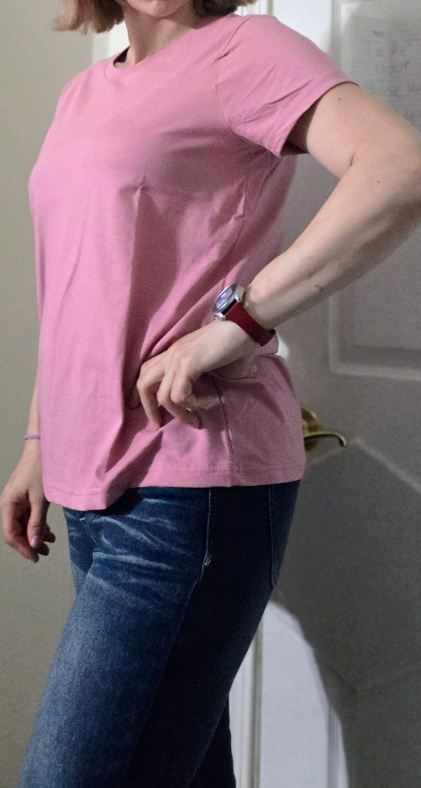 I like this shirt because the shoulders fit but it’s relaxed around the stomach. The fabric is also very nice - soft but not too stretchy or clingy and it doesn’t wrinkle easily.