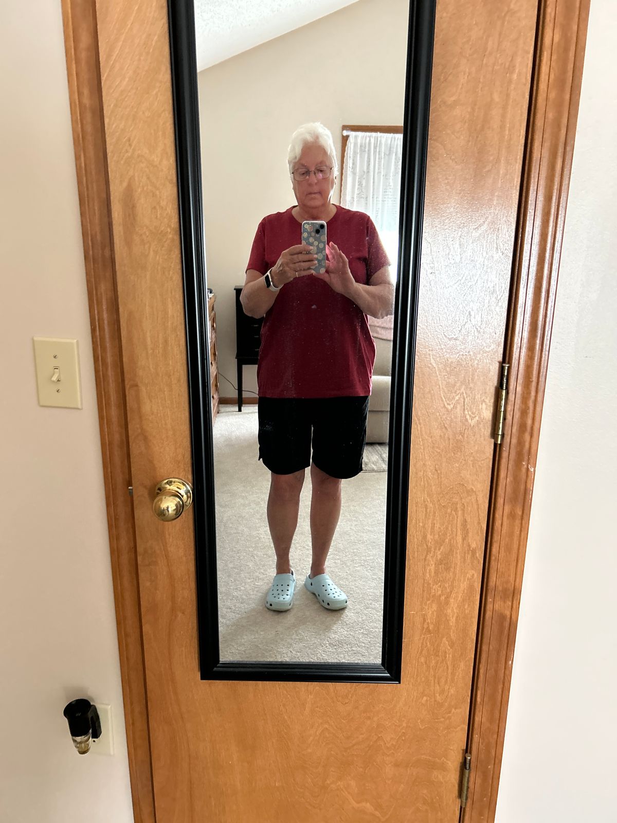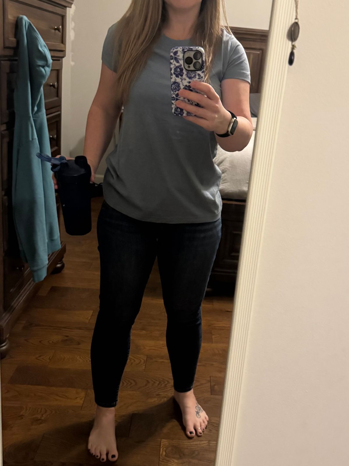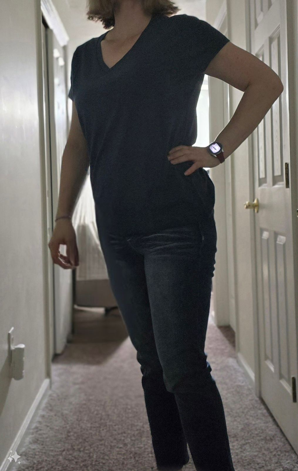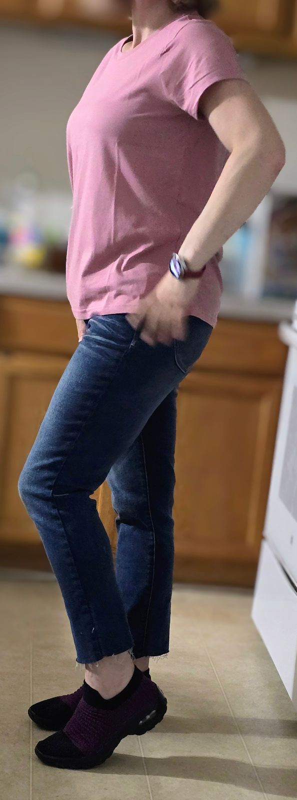 I like this shirt because the shoulders fit but it’s relaxed around the stomach. The fabric is also very nice - soft but not too stretchy or clingy and it doesn’t wrinkle easily.