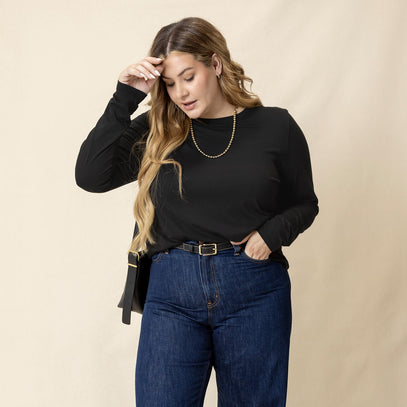 This long sleeve crew neck tee is gently contoured to follow your shape. Never clingy, always comfortable. Made from our beloved Stratusoft fabric, it layers like a dream and looks polished on its own.| Size | Sleeve | Bust | Length |